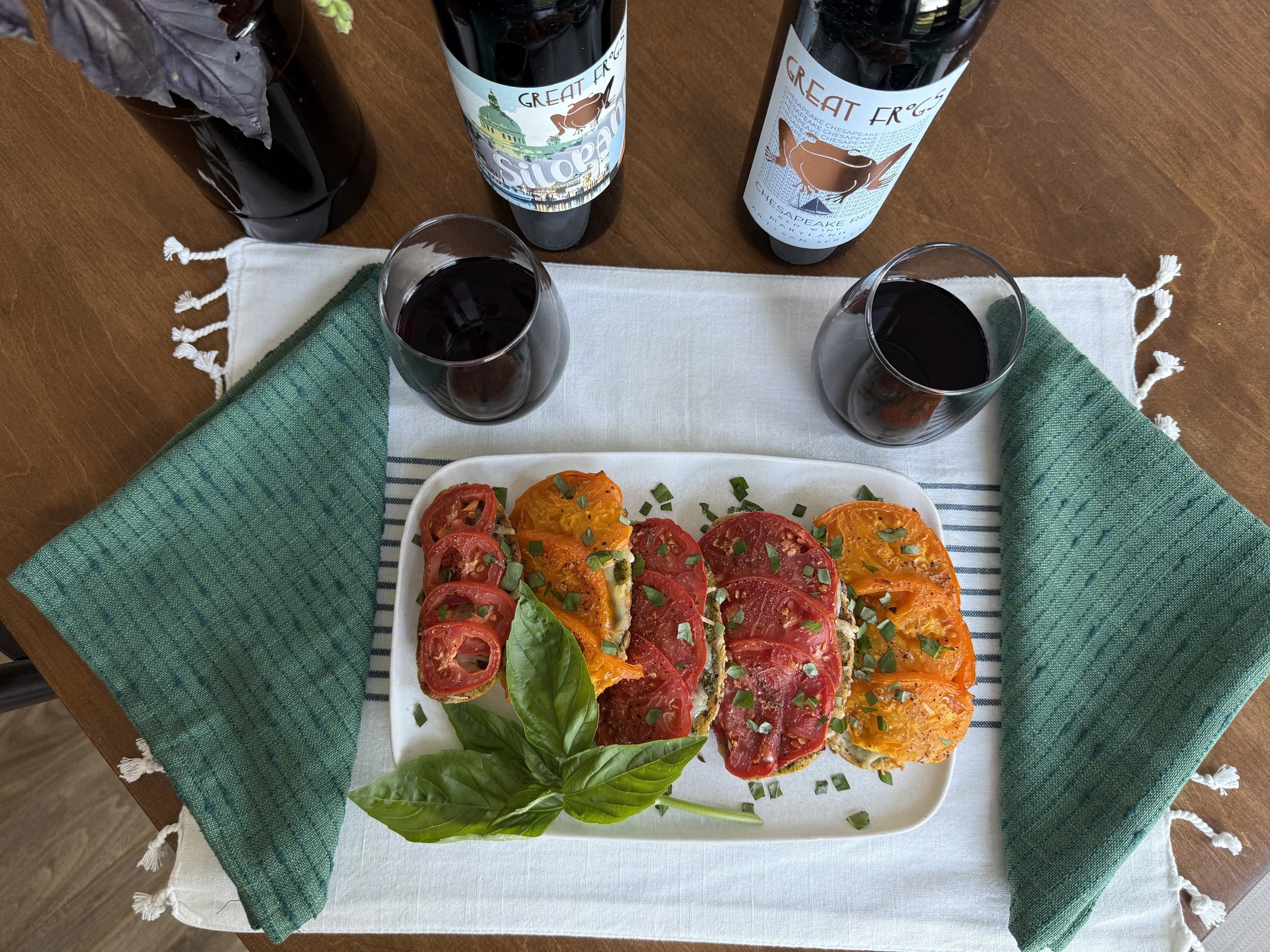 Bruschetta can be easily transformed into an appetizer, a snack, or a light meal. The possibilities for creating a delectable bruschetta are virtually limitless. We opted for fresh sourdough, pesto, a diverse selection of cheeses, ripe tomatoes, and a sprinkle of chopped fresh basil. To make it a shareable dish, we added a couple of varieties of excellent Great Frogs, red wine, and voila! You have a simple yet delightful meal for two! Enjoy!