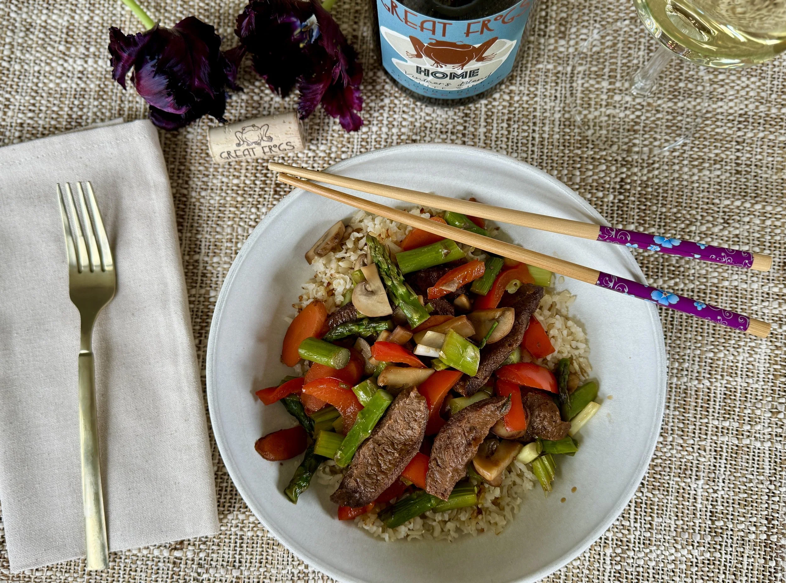 Filled with crisp–tender vegetables, crunchy rice, and in this version, marinated flank, steak, sliced thin, this Bibimbap is a delightful combination. Traditionally, the vegetables are prepared separately and displayed in the bowl of crispy basmati, rice, with optional meat on the side, topped with a fried egg, cook, sunny side up. For simplicity and time saving purposes, I opted to stir, fry the vegetables and meat together. Seasoned with a blend of soy sauce, brown sugar, and Korean gochujang sauce, this dish brings a delightful balance of flavors. It's my newfound love for vegetables and rice! To complement the bibimbap, I served it with Great Frogs Home, White, a wine with a slightly sweet and soft mouth feel and crisp finish. A lovely pairing, even though I had included beef. Enjoy!
