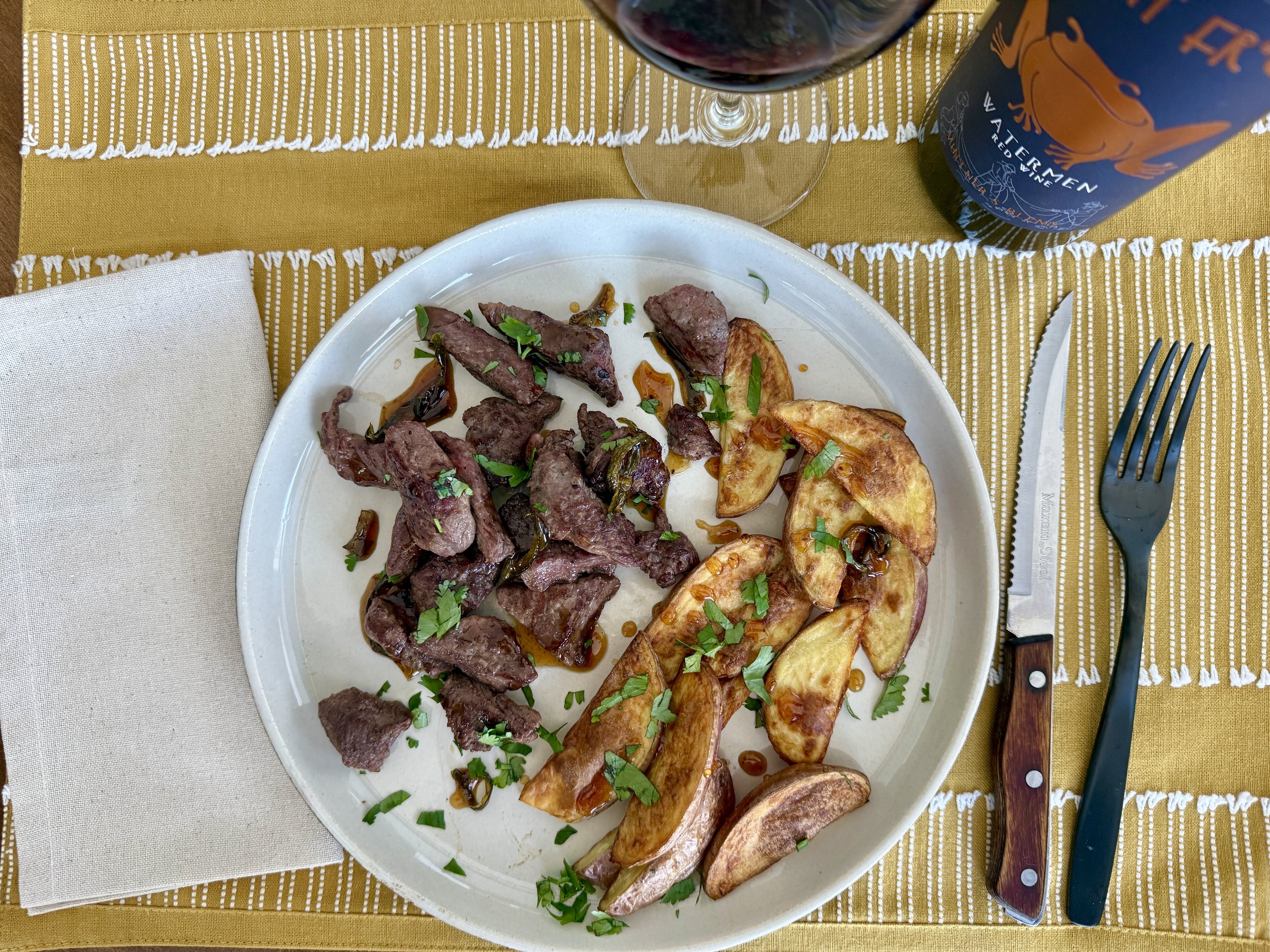A simple meal is elevated by pairing it with Waterman a vintage from Great Frogs Winery. This recipe uses sirloin steak tips, served medium-rare to enhance their flavor and tenderness. A honey jalapeño glaze is drizzled on top. The steak tips and potato wedges add a slightly spicy yet delicate sweetness to this entrée. Garnished with chopped cilantro, it’s a delightful combination. Enjoy!